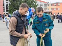 Будущие спасатели обучали гостей навыкам вязки узлов, показали приёмы сердечно-лёгочной реанимации на манекене и предложили примерить пожарное снаряжение.
