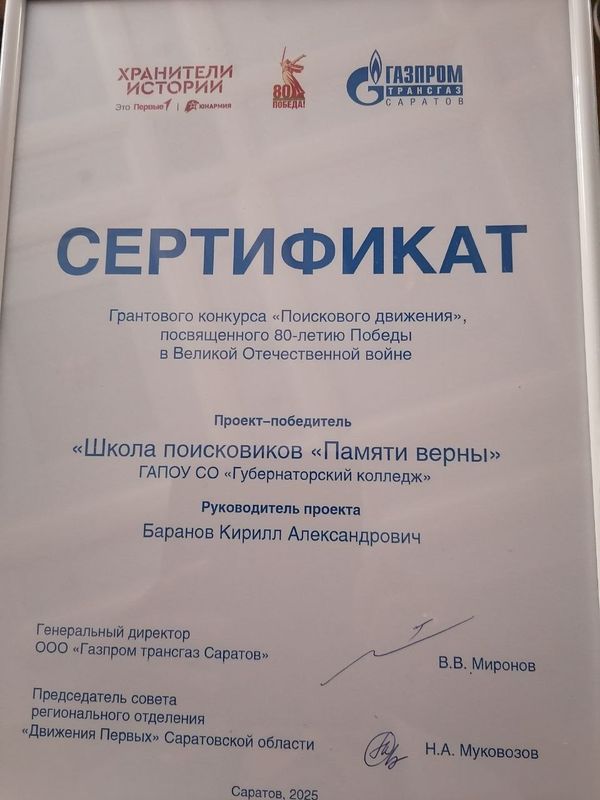 В апреле этого года ребята стали победителями грантового конкурса «Поискового движения», посвященного 80-й годовщине Победы в Великой Отечественной войне. Организаторами конкурса выступили ООО «Газпром трансгаз Саратов» и Саратовское региональное отделение Движения Первых. Благодаря выигрышу поисковый отряд закупил специальное оборудование, провел серию обучающих мероприятий и даже побывал на Вахте Памяти на территории Городищенского района Волгоградской области.