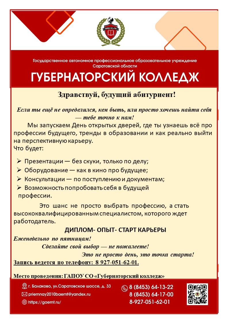 Приглашаем вас посетить День открытых дверей нашего колледжа. Это уникальная возможность познакомиться с учебным заведением, выбрать специальность мечты и задать интересующие вопросы сотрудникам и студентам.